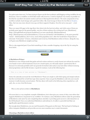 Markdown has many more powerful features and even more power in MultiMarkdown. Visit Fletcher Penny’s MultiMarkdown page to learn more. Of course my Markdown examples are simplistic, but they do provide a sense of why a text editor that supports Markdown is important to my workflow. For instance, many Markdown editors make the generation of Markdown code easier by auto-completing those asterisks or providing quick access to code characters on the iOS keyboard.