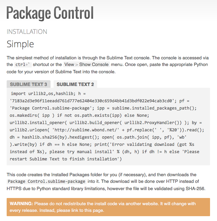 Now that we have a functional Sublime Text 2 install, its time to make it Arduino aware. We utilize the package feature of Sublime Text 2 to do this. Natively, Sublime Text 2 does not include a package manager; however, the folk(s) over at https://sublime.wbond.net have created the standard in Sublime Text package managers.
